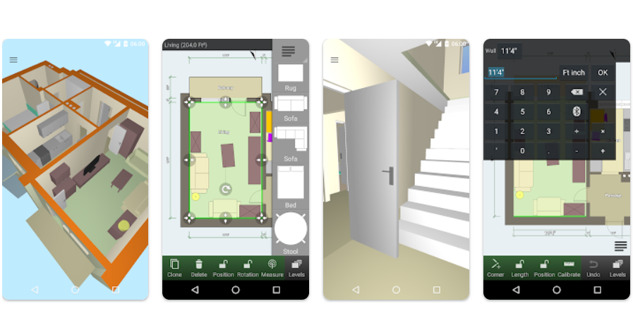 Rooms of any shape can be designed with this app. Automatic calculation of room, walls and level area is a salient feature of this application. The app possesses a symbol library which consists of symbols for doors, furniture, windows, fire survey, electrical and so on. The 3D tour mode is an amazing visual experience. Cloud synchronization is another important feature which enables to automatically backup and share plans between devices.