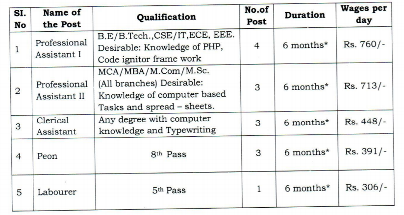 Professional Assistant I – There are four vacancies, the daily wage is Rs 760. The required qualification is B.E/B.Tech., CSE/IT, ECE and EEE. Knowledge of PHP, Code igniter frame work is desirable.