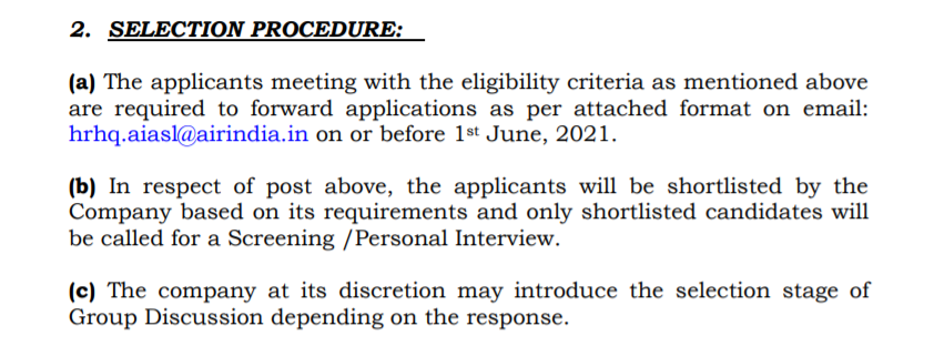 Interested Applicants meeting with the eligibility criteria are required to forward their applications in prescribed format on hrhq.aiasl@airindia.in before 1st June, 2021 . The documents are required, while appearing for interviews are a recent colored passport size photograph, Self-attested copies of the supporting documents must be submitted along with the application. Original certificates should be brought for verification only. Not any other mode of application will be accepted. Please go through notification carefully.