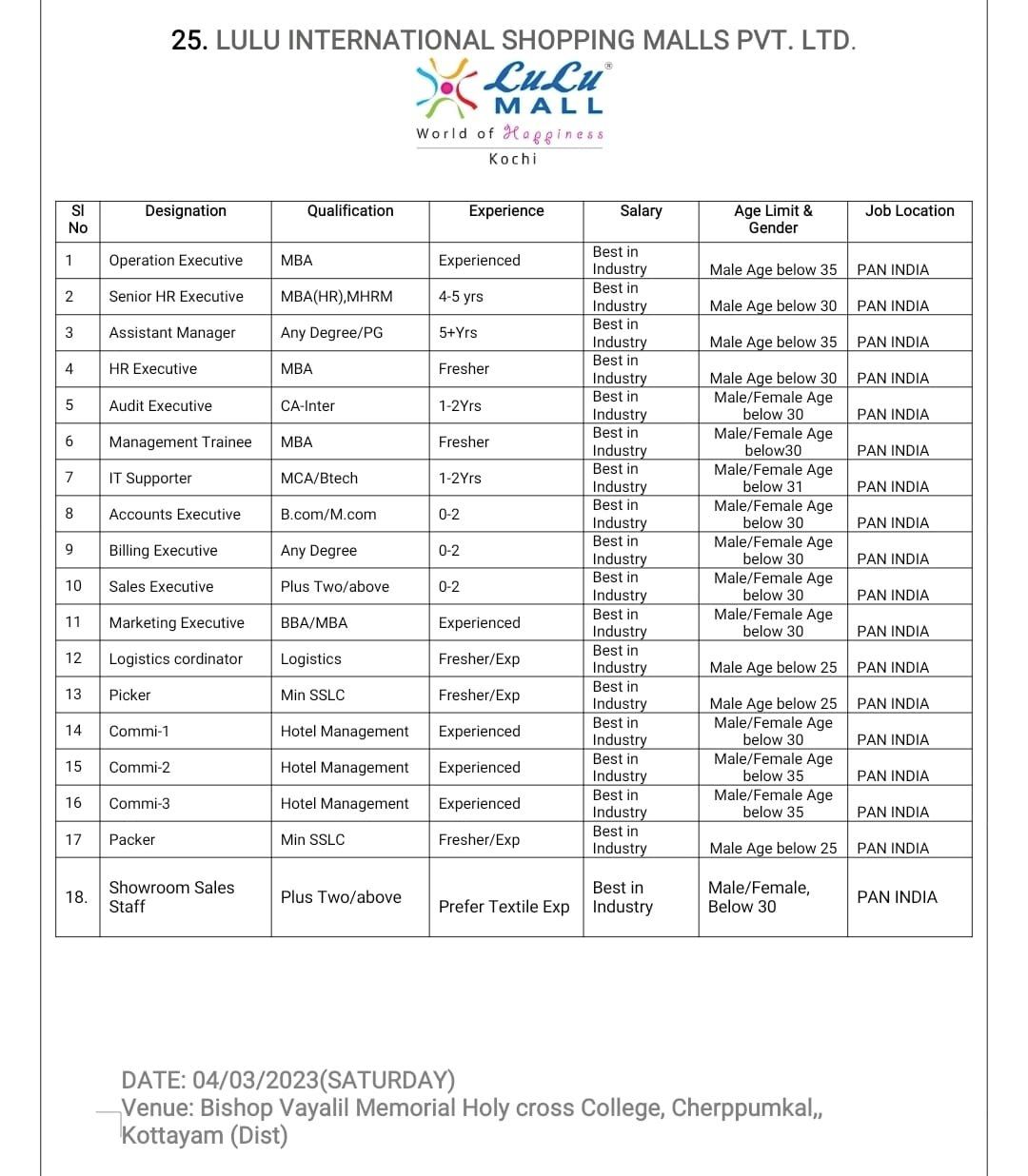 Employability Centre, Kottayam has been released an official notification regarding the recruitment on their official facebook page. They intend to fill up several Vacancies in different companies such as Prabhu steels, Kalliyath group, westleys resto cafe and lulu mall kochi.