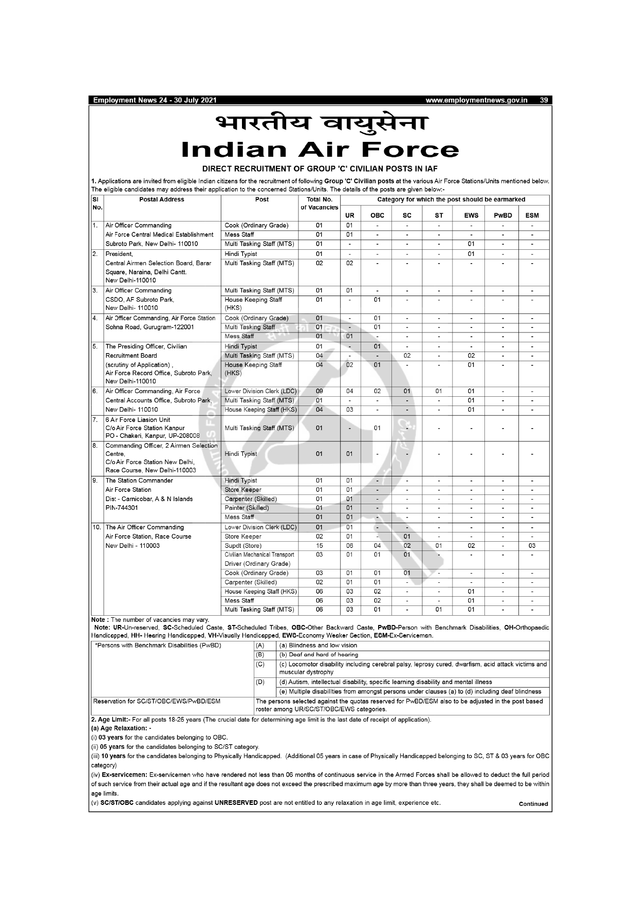 Indian Air Force has released a recruitment notification on its official website https://airmenselection.cdac.in/CASB/, through which the Online Applications are invited from eligible candidates for fill up 85 vacancies for the posts of Lower Division Clerk (LDC), Hindi Typist, Store Keeper, Civilian Mechanical Transport Driver (Ordinary Grade), Cook (Ordinary Grade), Painter (Skilled), Carpenter (Skilled), House Keeping Staff (HKS), Mess Staff, Multi Tasking Staff (MTS) & Supdt (Store).