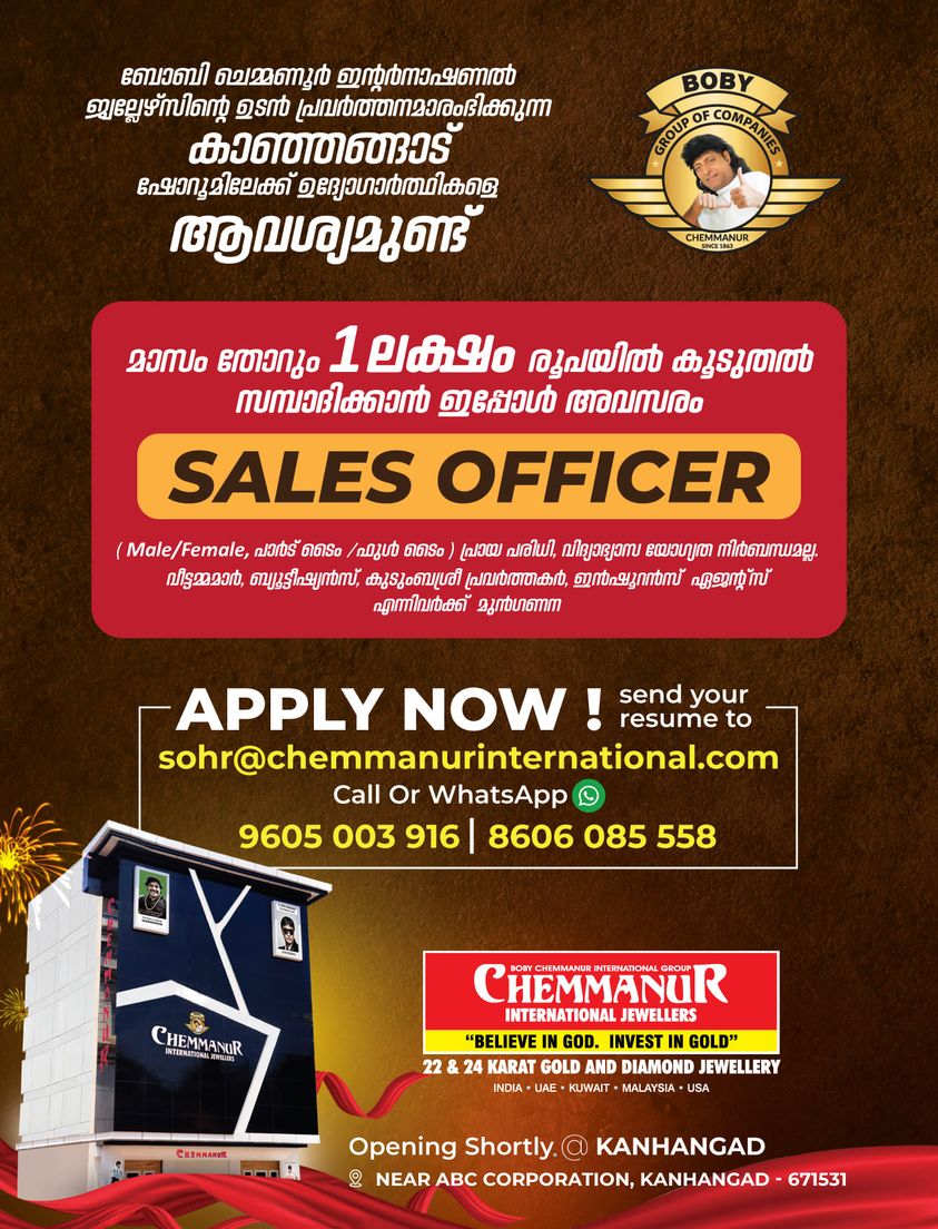 Chemmanur International Jewellers has released an official advertisement on their facebook page, regarding the recruitment for the post of sales officer. The posting will be on Kanhagadu showroom, opening shortly. Interestesd and eligible candidates are required to apply by whatsapp/ call/ or by email.