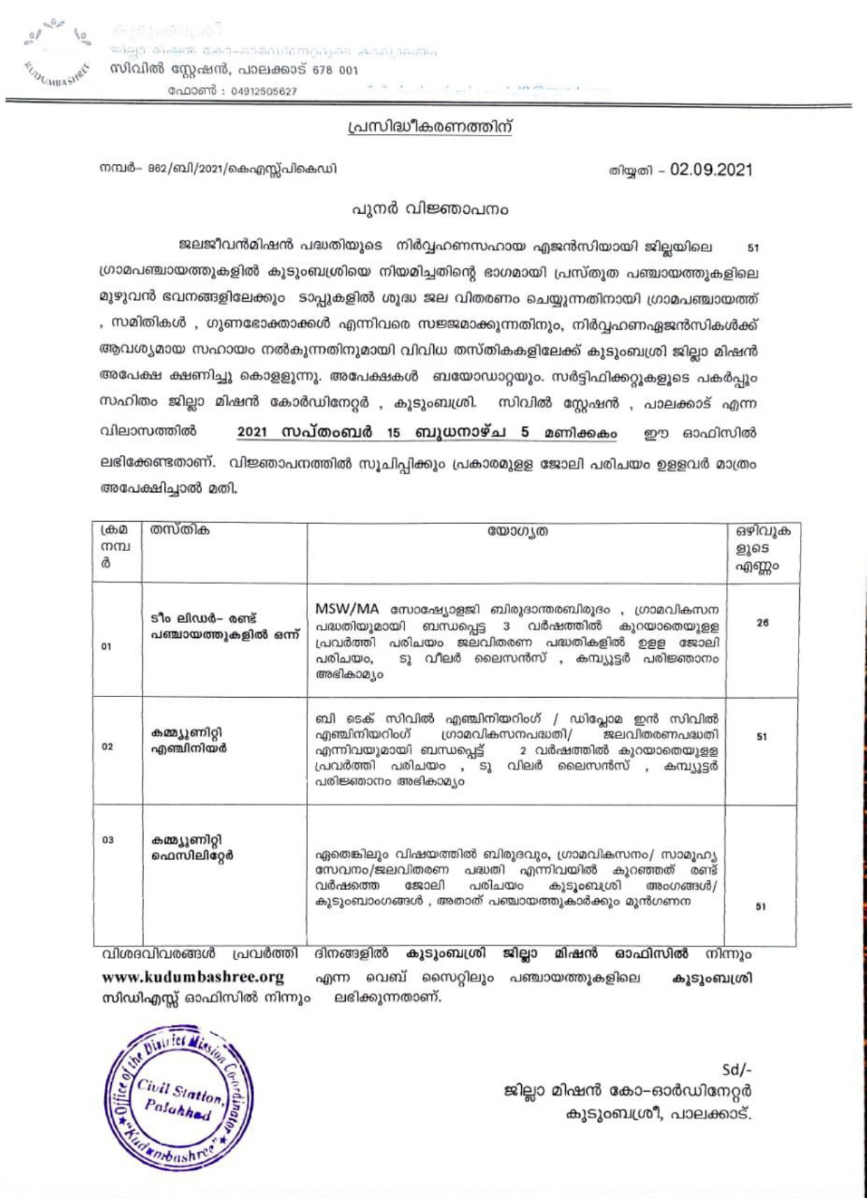 Kudumbashree has been released an official notification regarding the recruitment for various posts such as team leader, community engineer, community, Community Fecilitetar. Applications are invited from the Eligible candidates in prescribed format upto September 15, 2021.Candidates are advised to read the official notification to carefully before applying.