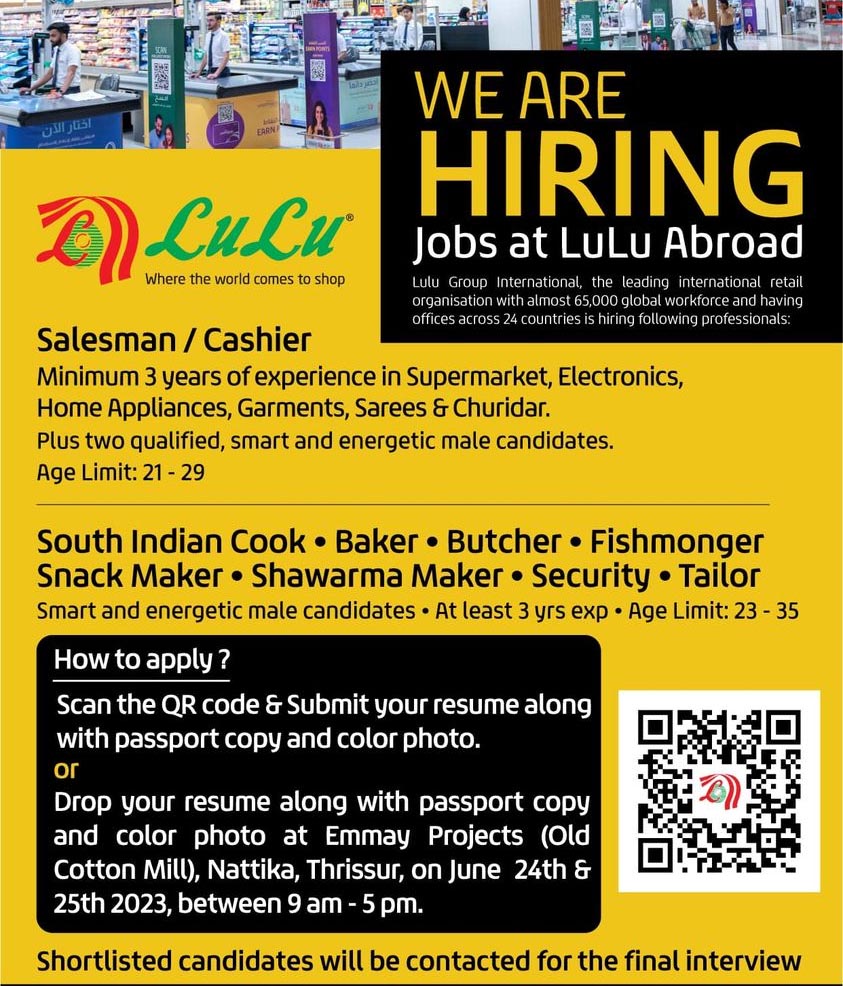 Lulu group is hiring eligible candidates for various post in abroad. Interested and eligible candidates are required to attend the walk in interview which is going to be held on February 23,2022 at Emmay projects premises, Nattika, Thrissur. Interested candidates are required to attend the walk in interview with updated resume and color passport copy. They intend to fill various vacancies for the posts such as , salesman, Tailors, security. Post wise eligibility criteria are given below.