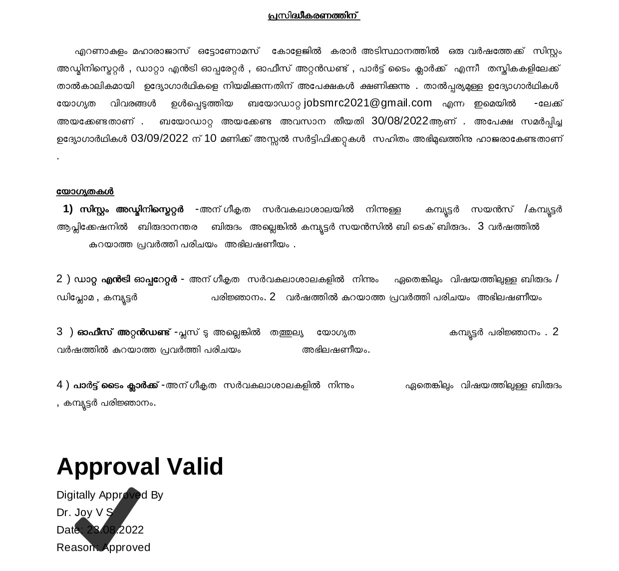 Maharajas College Ernakulam is hiring eligible candidates for various posts such as System administrator, Data entry operator, Office attendant and part time clerk. They are inviting application from interested candidates by sending latest updated resume to the mail id : jobsmrc2021@gmail.com on or before 30/08/2022. The applied candidates are required to attend the walk in interview to be held on 03.09.2022, 10 AM with all the required documents.