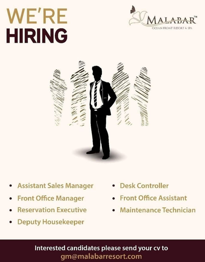 Malabar Ocean front resort & spa is hiring eligible candidates for various posts such as Assistant Sales Manager,. Front Office Manager, Reservation Executive, Deputy Housekeeper, Desk Controller, Front Office Assistant, Maintenance Technician. Interested candidates are required to Send resume to gm@malabarresort.com by mentioning designation in the subject. Please go through the official advertisement for more details.