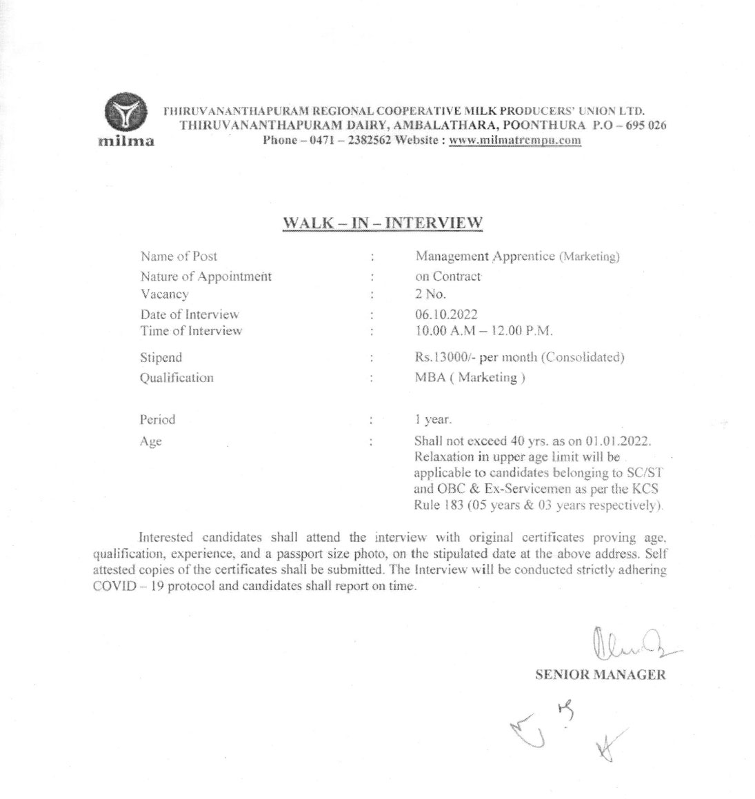 Thiruvanthapuram Regional Cooperative Milk Producers Union LTD has been released an official notification regarding the recruitment on their website. They intend to fill up various Vacancies of Management Apprentice ( Marketing ). Those candidates who are willing to apply are required to attend the walk in interview on 6th October 2022. For more details such as post wise educational qualification, salary &age limit details, applications fees, how to apply and so on, please refer the below paragraphs.