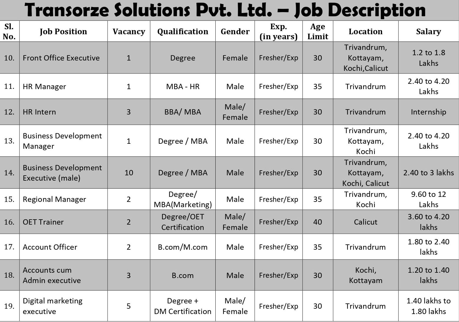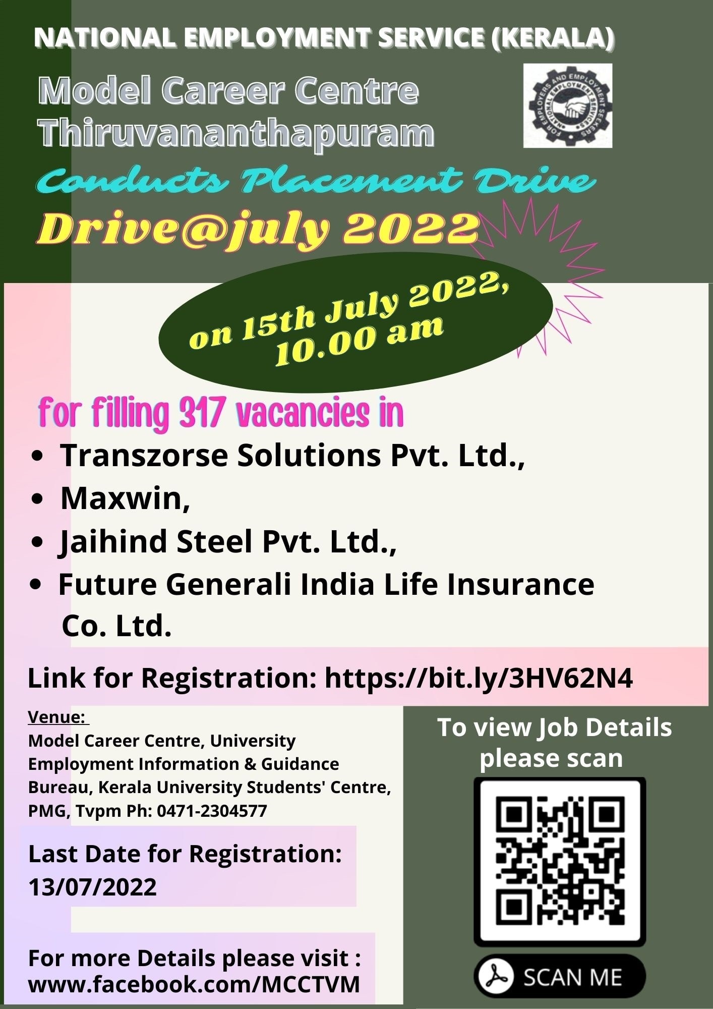 Model Career Centre – Thiruvananthapuram has published an official advertisement regarding Placement Drive, hiring eligible candidates for various posts in several companies. The job fair is conducting for filling 317 vacancies in Transzorse Solutions pvt Ltd , Maxwin, Jaihind Steel Pvt Ltd & Future Generali India life insurance Co.Ltd. The placement Drive is scheduled to be conducted on 15/07/2022.