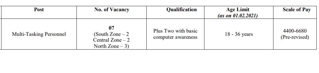 മൾട്ടിടാസ്കിങ് പേഴ്സണൽ തസ്തികയിൽ ഏഴ് ഒഴിവുകളാണുള്ളത്. ഇതിൽ സൗത്ത് സോണിൽ 2 ഒഴിവു൦, സെൻട്രൽ സോണിൽ രണ്ടു ഒഴിവും, നോർത്ത് സോണിൽ മൂന്ന് ഒഴിവും ആണുള്ളത്. തസ്തികയിലേക്ക് നിശ്ചയിച്ചിരിക്കുന്ന ശമ്പളം 4400 രൂപ മുതൽ 6680 രൂപവരെയാണ്. 18 വയസ്സു മുതൽ 36 വയസ്സ് വരെയാണ് പ്രായപരിധി. തസ്തികയിലേക്ക് അപേക്ഷിക്കാനുള്ള യോഗ്യത ഏതെങ്കിലും അംഗീകൃത സ്കൂളിൽ നിന്നും പ്ലസ് ടു പാസായവർക്കും കമ്പ്യൂട്ടർ പരിജ്ഞാനം ഉള്ളവർക്കും ആണ്.