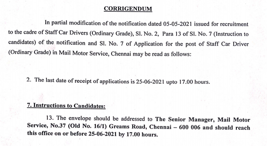 Interested candidates can send the offline application through speed post with all the required documents. Candidates should pay 100 rupees as application fees. Age proof, educational qualification, experience, driving license,Community should be Submitted as certificates or documents along with application form. Candidates should superscribe the application and envelop us “application for the post of staff car driver in male Motor Service, Chennai, 600,006”. Candidates are requested to read official notification carefully before going to apply.