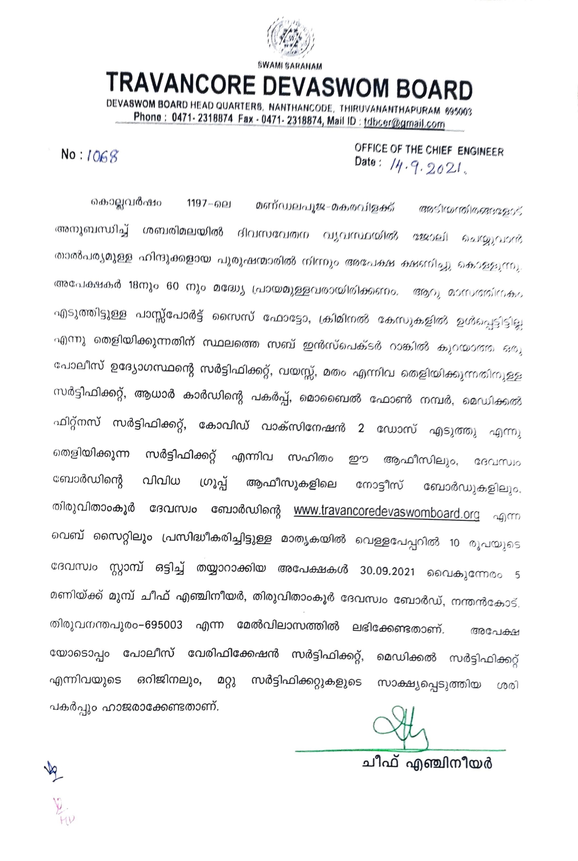 Postal Address : Chief engineer, thiruvithamkoor devaswom board, Nanthancodu, Thiruvananthapuram, 695003.
