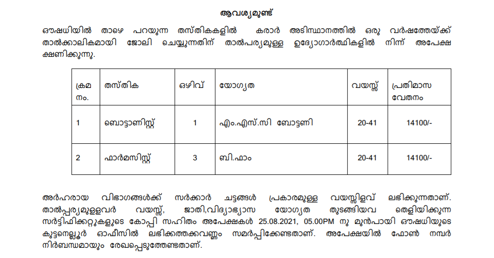 Applications are inviting for various posts in temporary work for one year on contract basis. Oushadhi’s new notification has come up inviting applications from interested candidates for the posts such as Botonist and Pharmacist . Interested candidates submit their applications to the office before 5 pm on August 25.