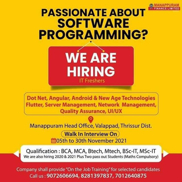 Manappuram finance Limited is hiring eligible candidates for various posts. Interested and eligible candidates are required to attend the walk in interview on November 30th,2021 at manappuram head office, Valappad, Thrissur. Please refer official advertisement given below for more details.