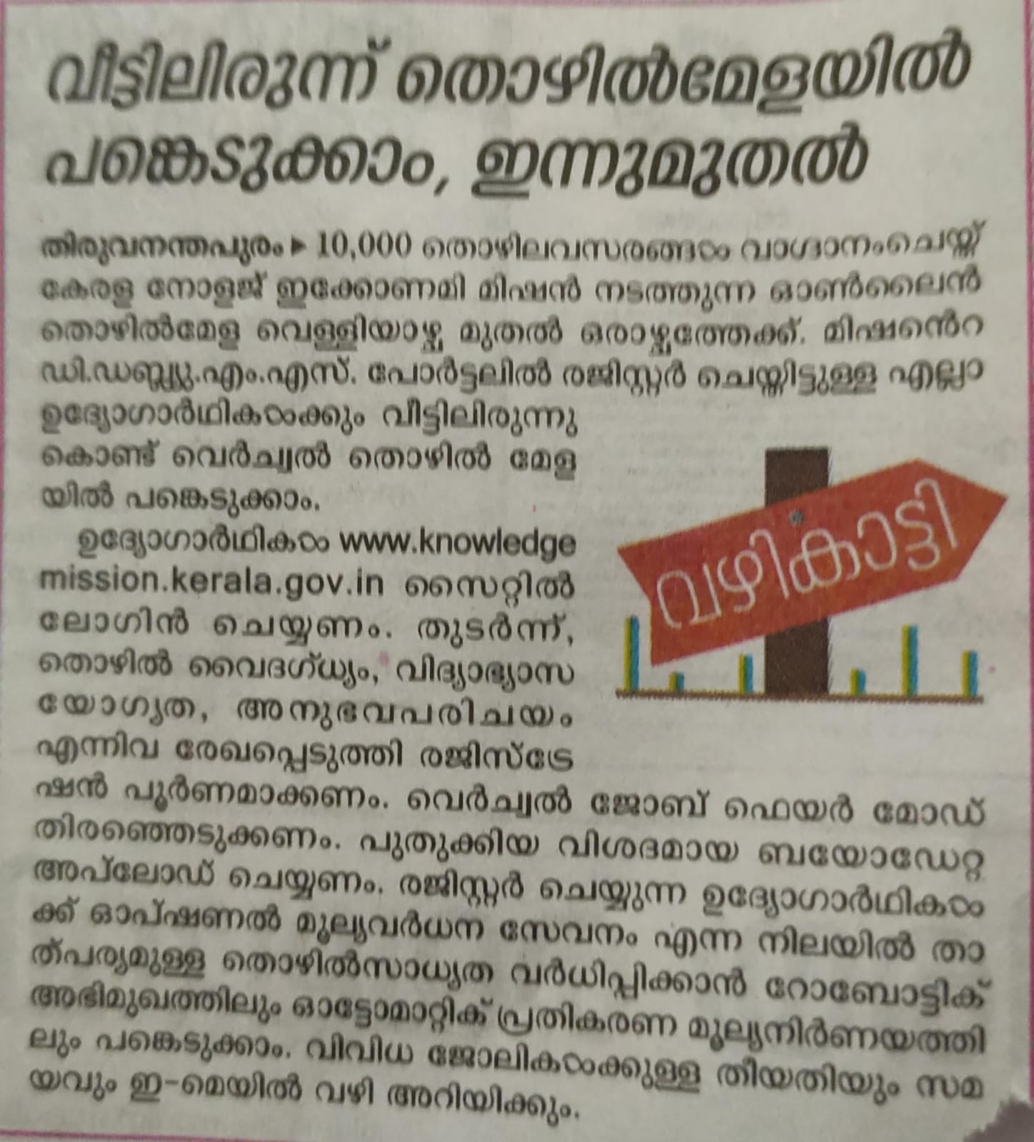 Kerala Knowledge Economy Mission is conducting Virtual Job Fair. Interested and eligible candidates are required register by online (official website link given below). The last date to register online is 28-01-2022. The Virtual Job Fair will start from January 21st onwards for 1 week. There are total number of 10,000+ plus job openings in various categories for students from any educational qualification available.
