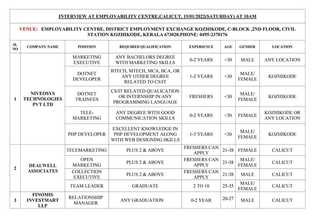 Employability center, Calicut has been released an official notification regarding the recruitment for the various posts for 3 companies (Niveosys technologies Pvt Ltd, Deal well Associates, Finomis Investmart LLP) .. Those candidates who are willing to apply are required to attend the walk in interview which is going to be held on january 15th,2022. For more details such as post wise educational qualification, salary &age limit details, applications fees, how to apply and so on, please refer the below paragraphs.