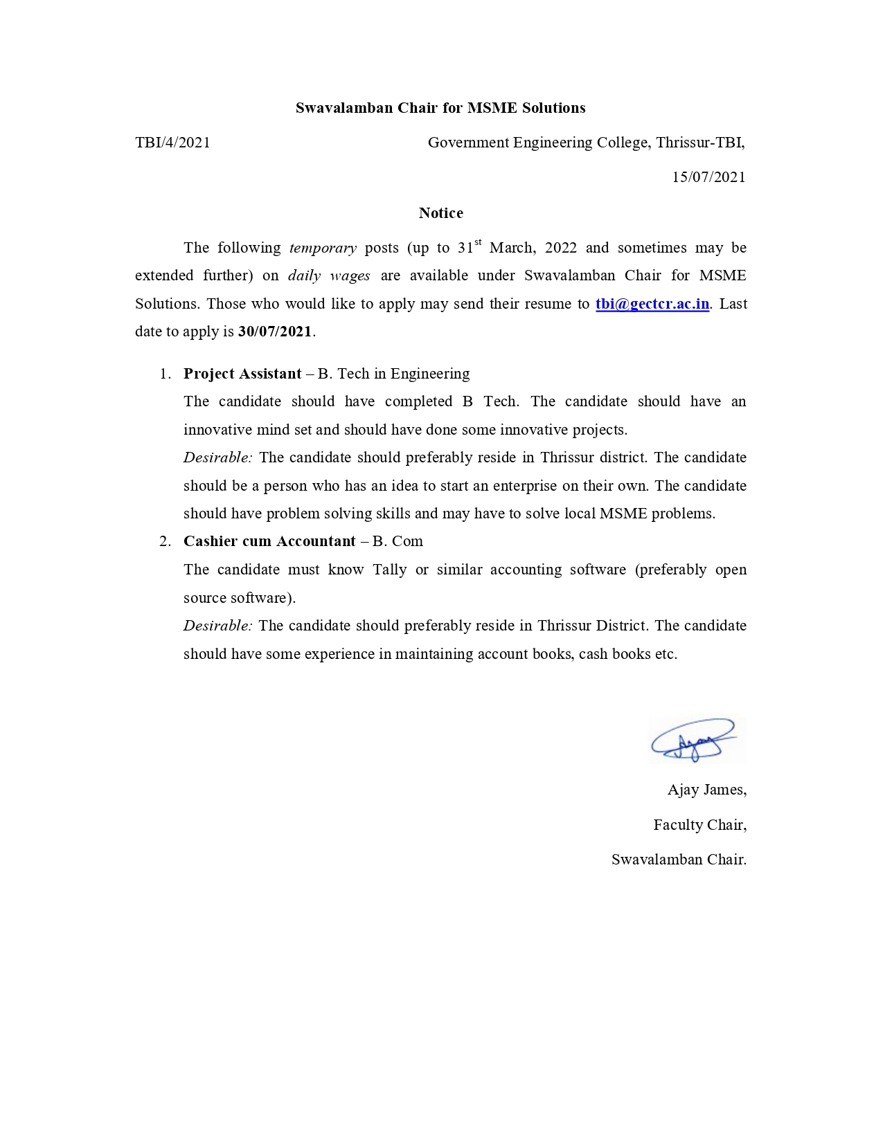 2. Applications are invited for various posts in Thrissur Government Engineering College. There is an opportunity for the posts of Project Assistant and Cashier/Accountant. There are one vacancies each in both the posts. Applications have been invited for temporary vacancy in the Swa Lamban Chair in the college. Interested candidates may send their resume to tbi@gectcr.ac.in before